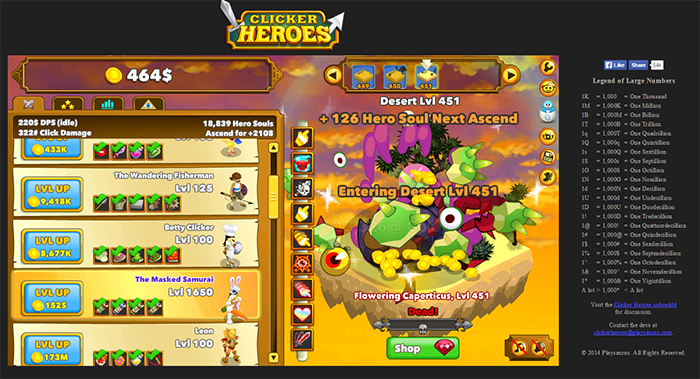 Ebenfalls seinen Start auf Kongegrate erlebte „Clicker Heroes“. Dieses Game lässt sich aber auch direkt über clickerheroes.com spielen und erhielt am 15. April das „GreenLight“ auf Steam, wobei die Erscheinung die auf Frühling 2015 angekündigt ist bis jetzt noch aussteht. Der besondere Kick den Clicker Heroes der bisherigen Formel verleiht ist der „Kampf“ gegen animierte Monster. Von Ratten über Mimics über Elementargeister bis hin zu einem seltenen Kappamonster ist die Auswahl dabei völlig zufällig aber amüsant. Getötete Monster verteilen ihre Augen und Innereien in Comicgrafik auf dem Bildschirm. Zusätzlich werden im Spielverlauf Fähigkeiten mit Cooldowns freigespielt die der Spieler kombinieren kann um den Schaden zu erhöhen. Ebenfalls verfügt Clicker Heroes mit dem „Ancients“-Sytem über das aufwendigste Reset-system (siehe dazu auch den entsprechenden Abschnitt) bei dem sich verschiedene Bonusbosse ebenfalls hochleveln lassen die verschiedenen Einfluss auf das Spielgeschehen haben wie vermehrtes Auftreten von Schatztruhen oder geringere Cooldowns für die verschiedenen Fähigkeiten.
