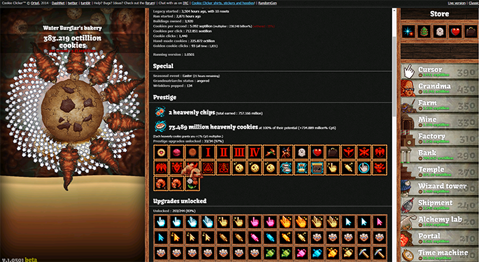 Eines der ersten Spiele dieser momentanen Welle an Idle Games ist (und) war Cookie Clicker. Das mit JavaScript realisierte Browsergame des Franzosen Julien Thiennot ist nicht der Ursprung des Genres oder der Mechanik, aber war für viele Spieler die erste Erfahrung mit diesem Spieltyp und hat das Phänomen erstmals einem etwas breiterem Publikum präsentiert. Die humorvolle Präsentation und Thematik hat sicherlich auch zum Erfolg beigetragen. Am Anfang wird man lediglich mit einem grossen Keks konfrontiert den man klicken soll. Durch diese Klicks verdient man sich dann Kekse mit denen man Cursor kaufen kann die für einen klicken und Kekse verdienen… Und mit diesen Keksen wiederum kauft man dann wiederum Gebäude die noch mehr Kekse backen…